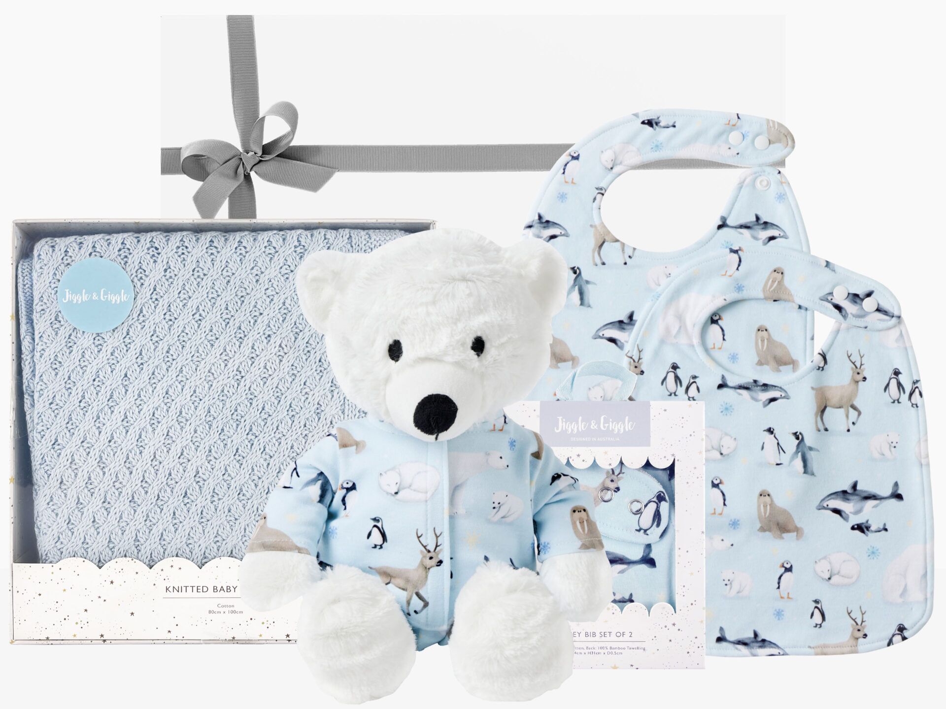 Aurora Baby Hamper includes products made with premium materials from the Jiggle and Giggle Aurora range. The blue weave blanket is the perfect lightweight companion for daily adventures. Polar Bear in Pyjamas was designed with adorable fashion in mind, dressed to impress, donning a removable romper made of 100% cotton jersey. The Aurora jersey bib set of 2 are made with 100% natural materials with jersey cotton on the front and absorbent bamboo towelling on the back.