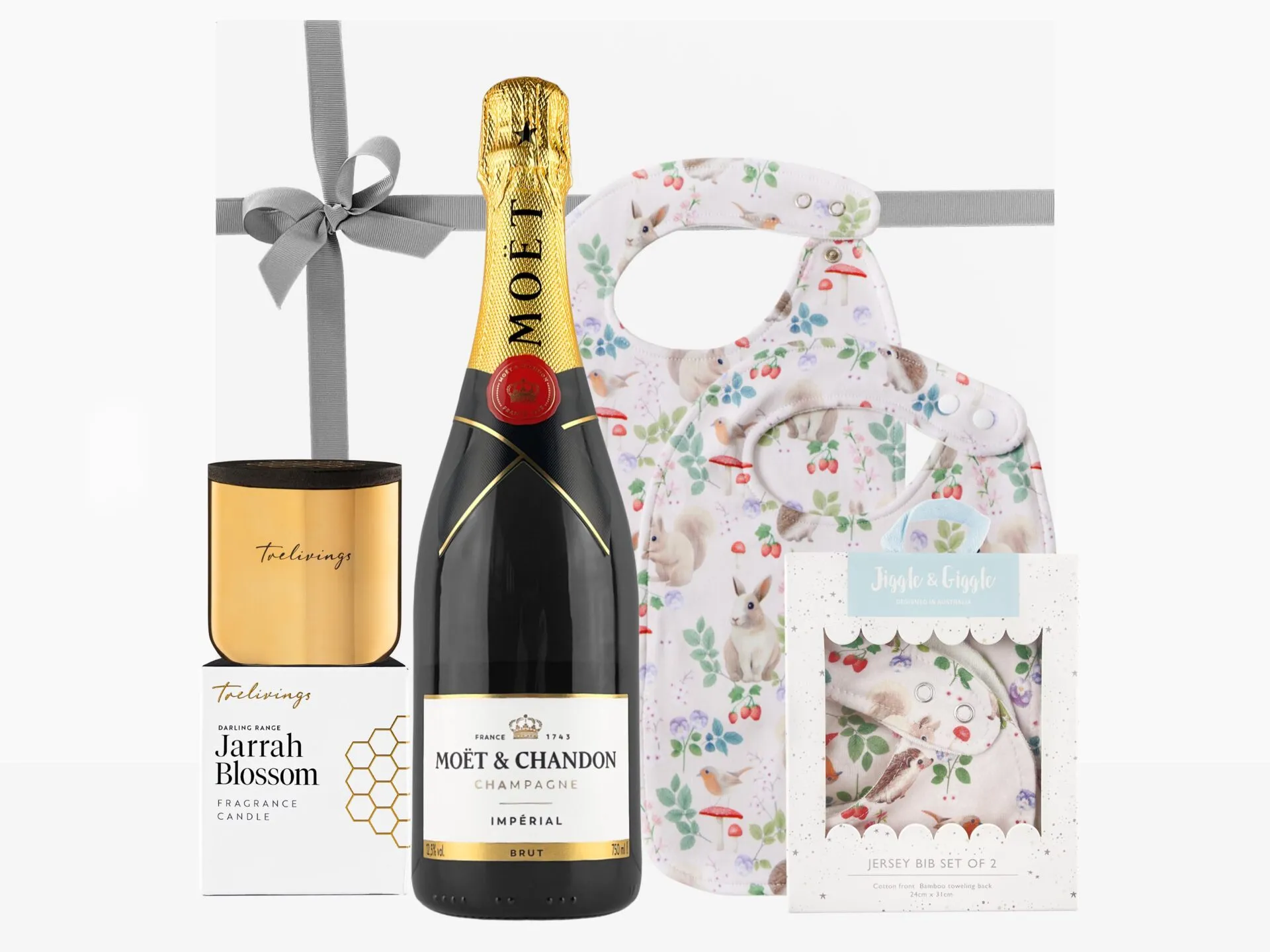 Baby Girl Champagne Hamper. Celebrate than the birth of a child with a bottle of the iconic Moet & Chandon Champagne. Accompanied by Trelivings Jarrah Blossom Candle, a scent sensation of springtime flowering of the Jarrah forest burst alive with brilliant layer of scents and nectar. This hamper wouldn’t be complete without an Enchanted jersey bib set for 2, made with 100% natural materials, it features cotton jersey on the front and absorbent Bamboo towelling on the back.