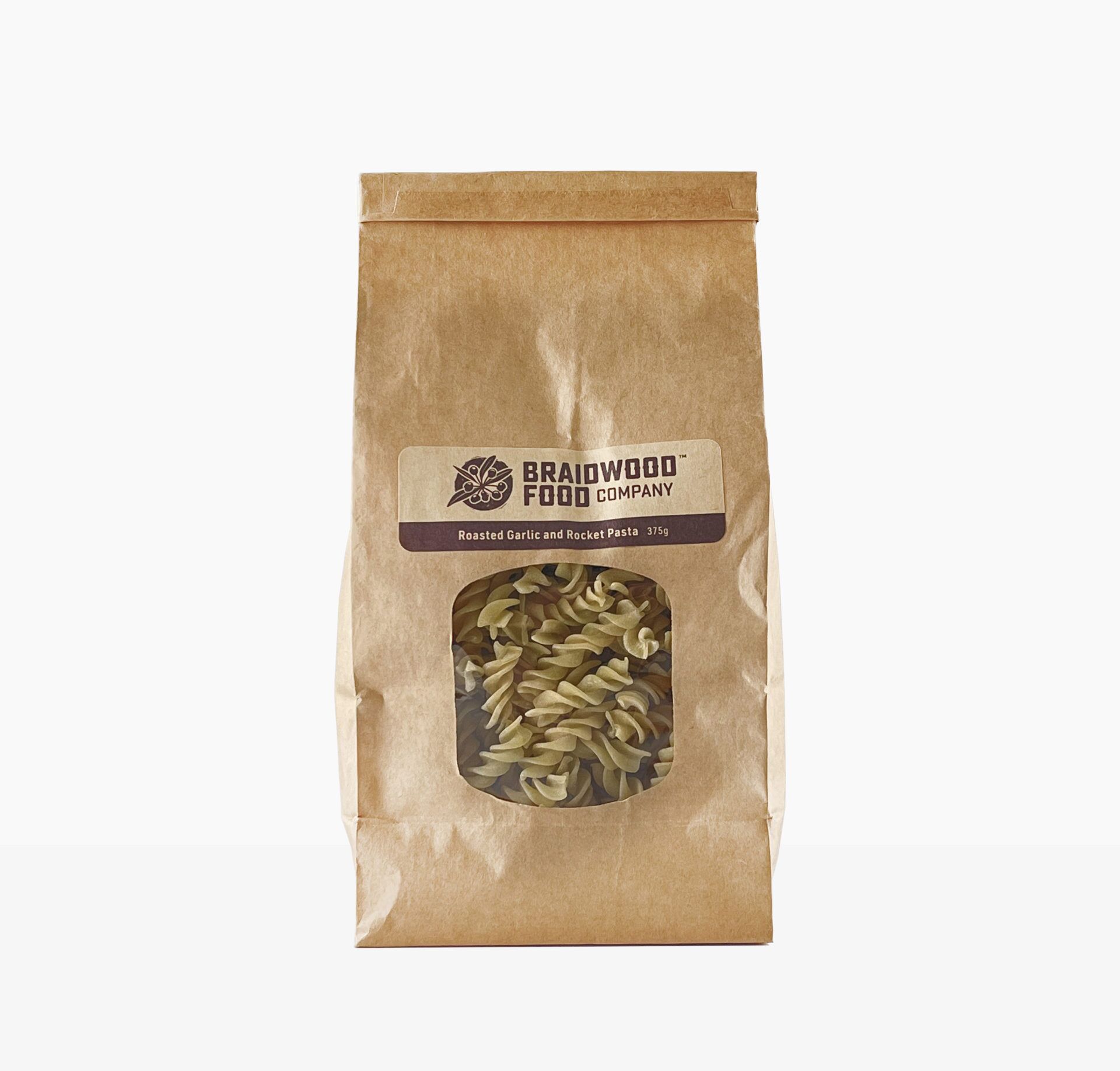 Braidwood Food Co. Pasta Roasted Garlic & Rocket. Braidwood Food Company produces hand crafted locally flavoured food. This pasta is made with fine durum semolina, organic rocket leaf and organic garlic.
