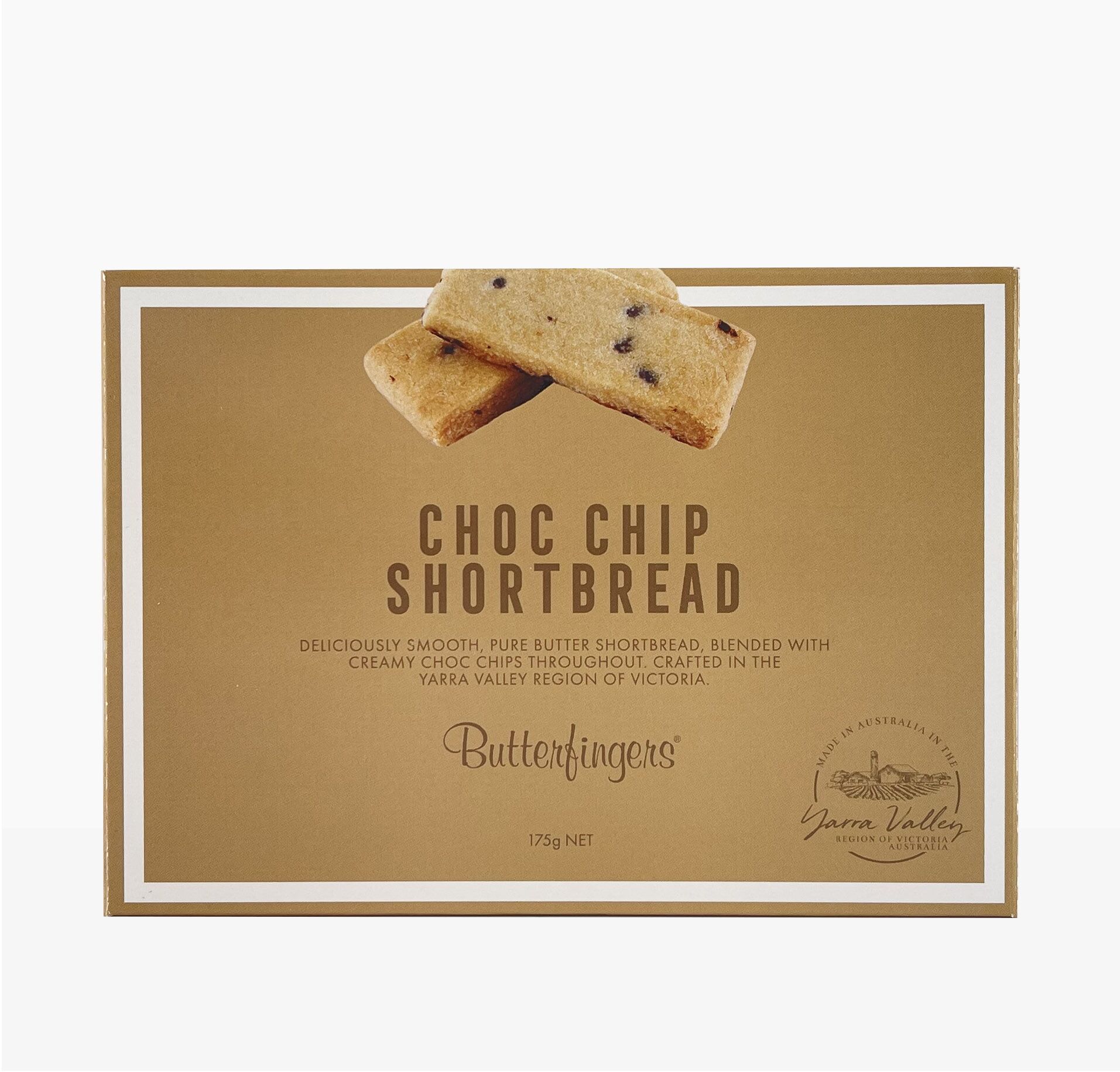 Butterfingers Choc Chip Shortbread. Deliciously smooth, pure butter shortbread, blended with creamy choc chips throughout.