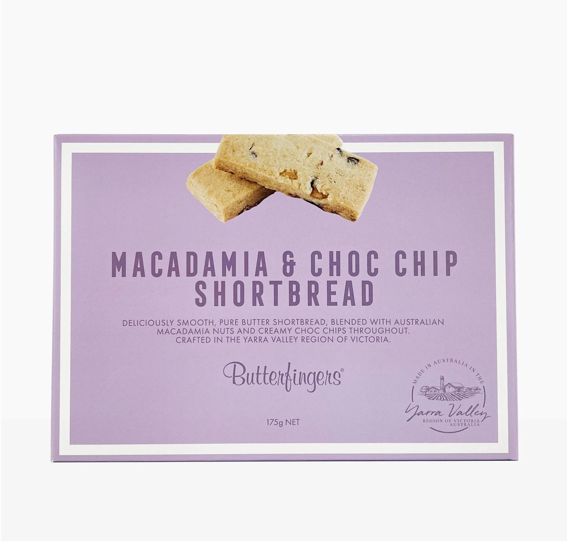 Butterfingers Macadamia & Choc Chip Shortbread. Premium, Macadamia & Choc Chip Shortbreads are made from the finest ingredients and are free from preservatives, artificial colours and flavours.175g