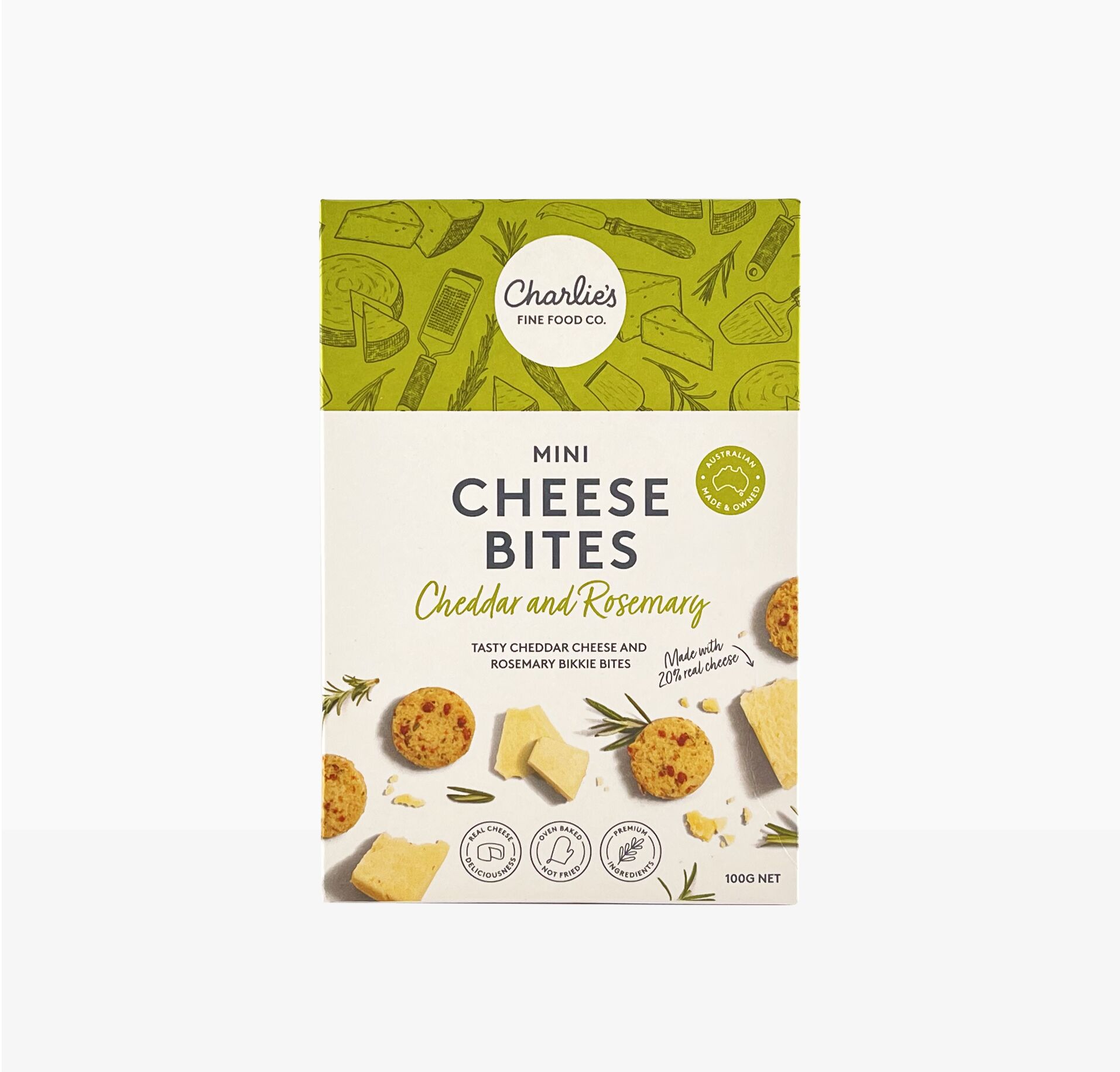 Charlie’s Cheddar & Rosemary Cheese Bites. Baked with quality Australian cheese, these Mini Cheese Bite are the perfect savoury snack for every occasion. Packed full of flavour, they are delicious on their own or as part of your grazing board.