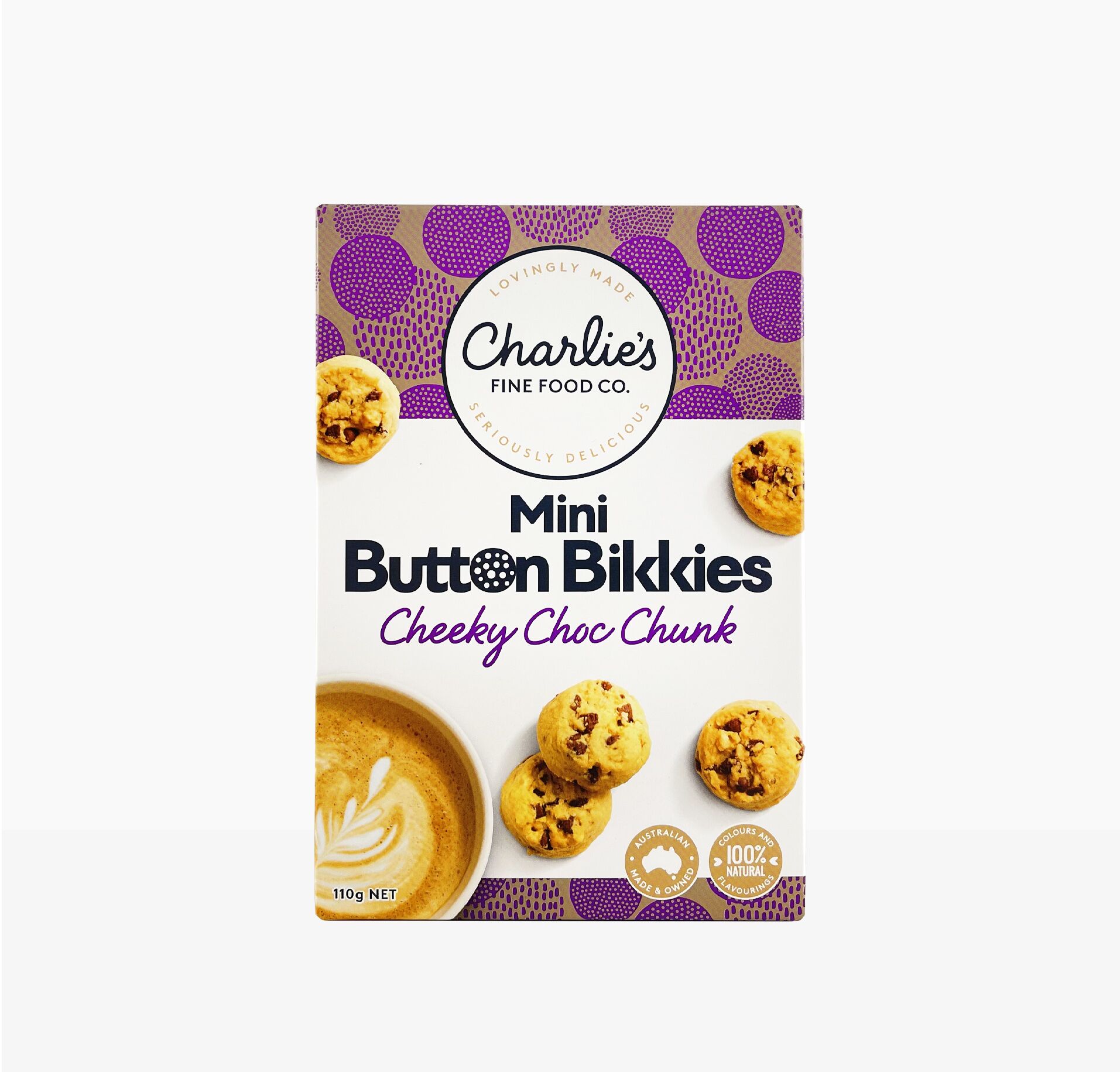 Charlie’s Choc Chunk Button Bikkies are made with premium ingredients. No artificial colours or flavours. Buttery button biscuits loaded with real chocolate. These Button Bikkies are seriously delicious.
