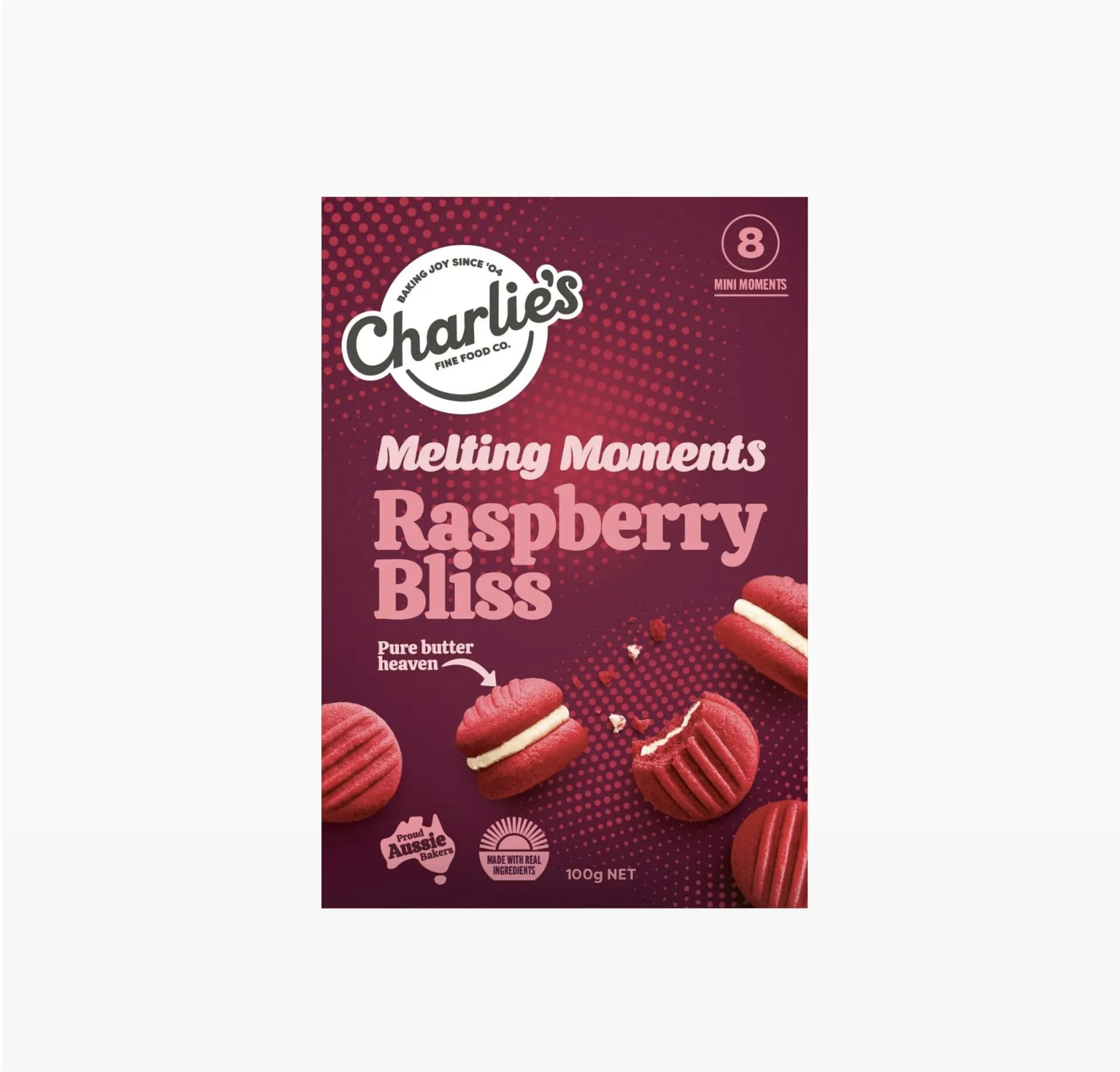 Charlie’s Raspberry Melting Moments. This carton of 8 delectable melting moments features a melt in your mouth raspberry biscuit shell, with a white chocolate butter cream.