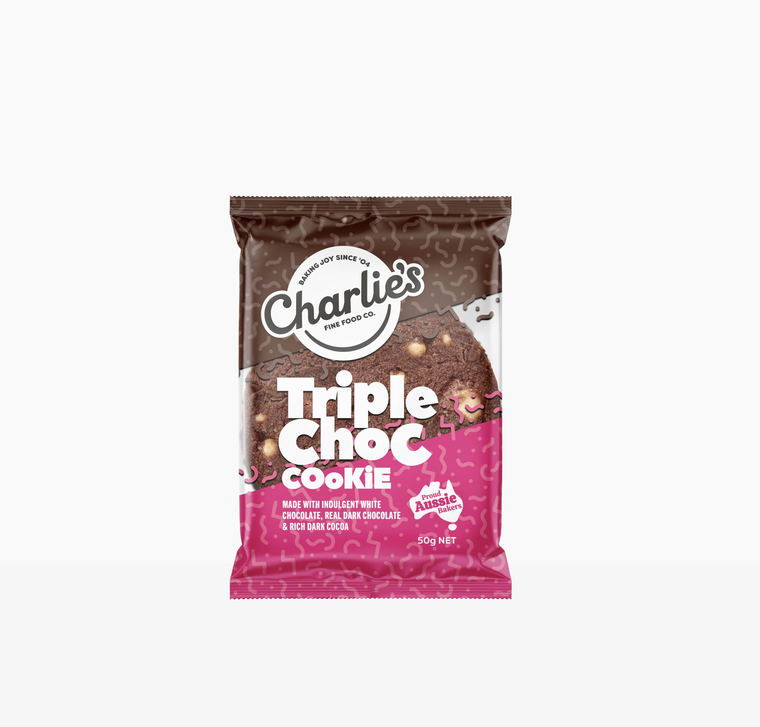 Triple Chocolate Artisan Cookie made with indulgent White and Dark Couverture Chocolate Chips, and rich dark Cocoa. Available in 50g individually wrapped packs.