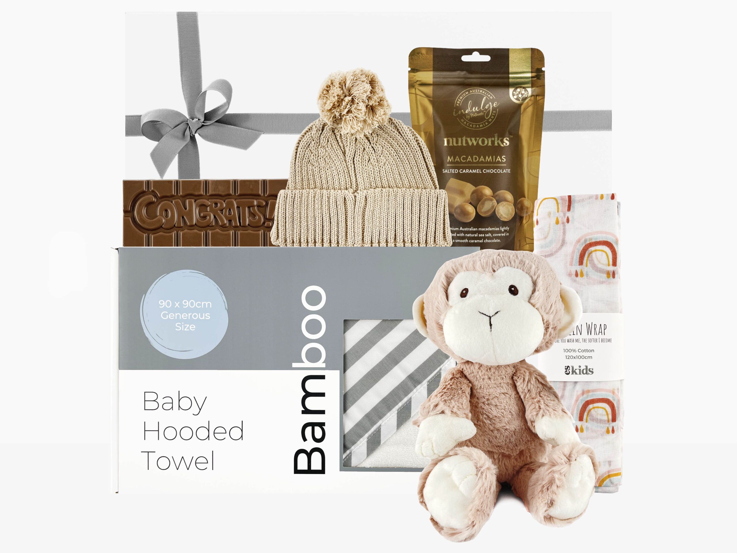 Celebrate a newborn with the Cheeky Monkey Baby Hamper, a playful gift perfect for baby showers and new arrivals. Featuring a soft plush monkey, gentle grey bamboo hooded towel, cosy baby beanie, rainbow muslin wrap, and indulgent treats for parents, this thoughtfully curated hamper delivers comfort, fun, and joy for both baby and family.