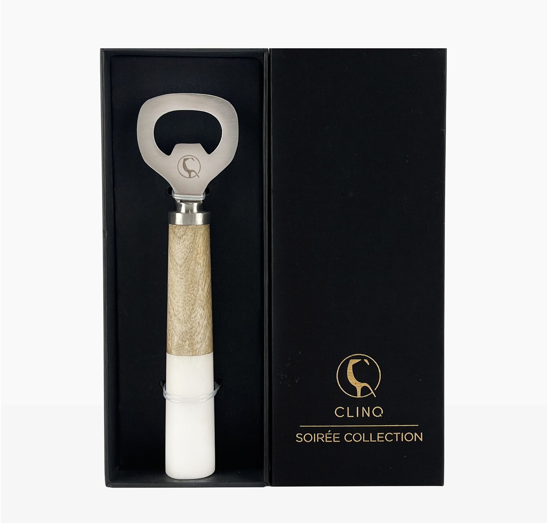Clinq Timber & Marble Bottle Opener is a classy bottle opener, handmade from acacia and marble with a brushed steel opener end.