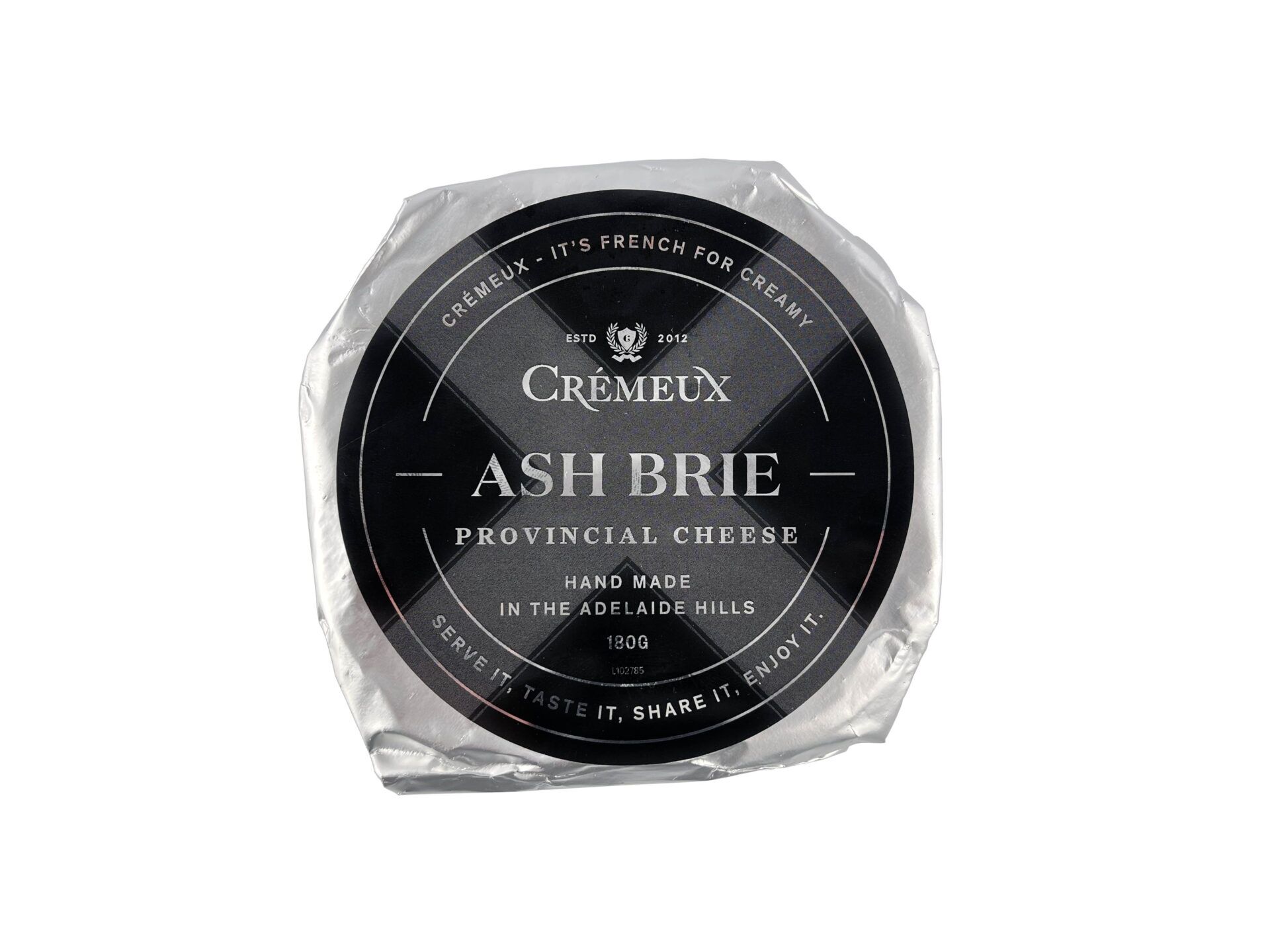 Cremeux Ash Brie. Ash is used in French cheese making to help draw out excess whey and neutralise the outside to enable surface rinds to develop quickly.