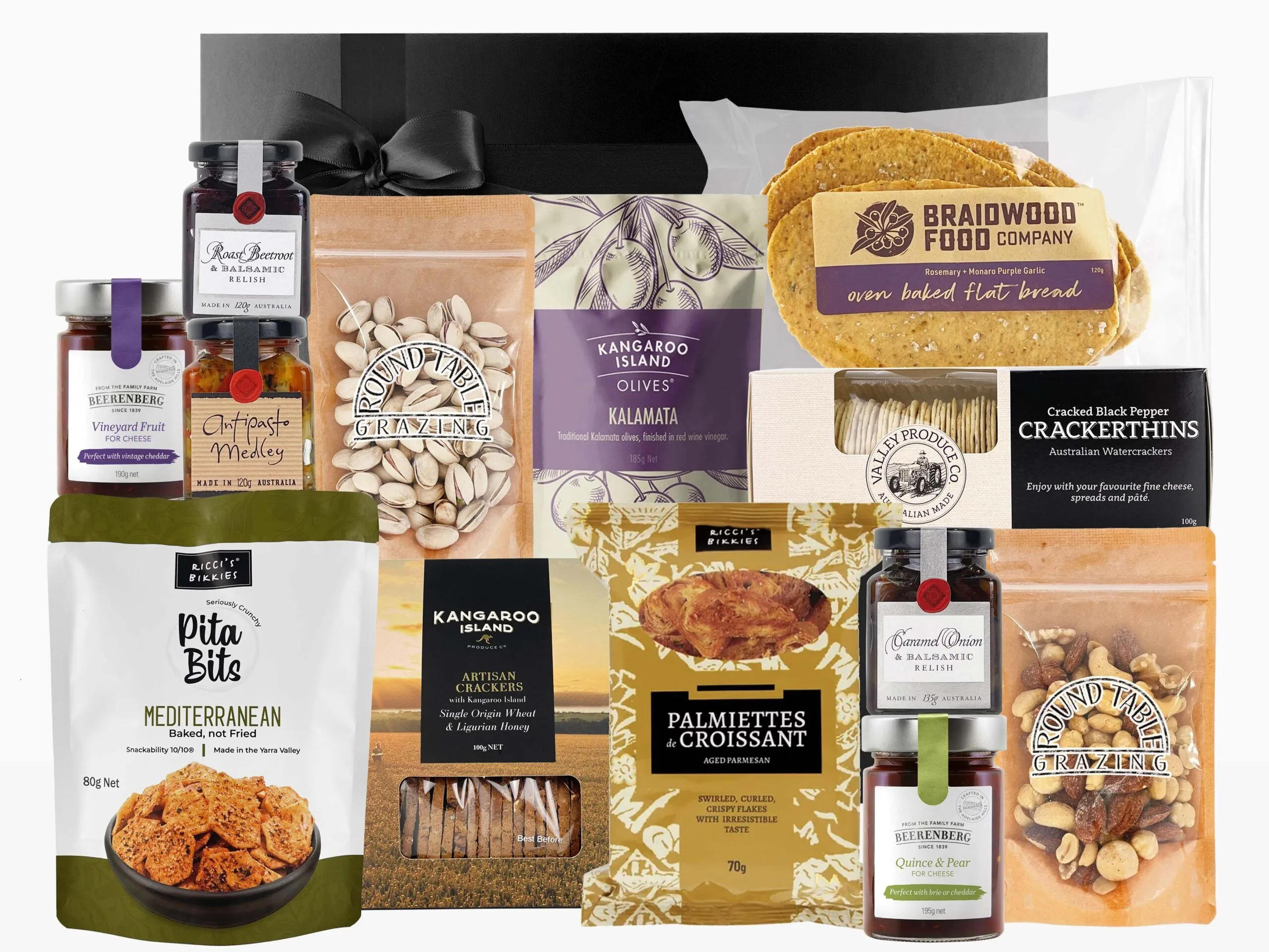 This hamper features a thoughtfully chosen mix of flavours and textures. Inside, you’ll find Ricci’s Mediterranean pita bits, Round Table pistachios, and Kangaroo Island artisan crackers. In addition, Kangaroo Island Kalamata olives provide a rich, briny note that pairs beautifully with cheese and wine.