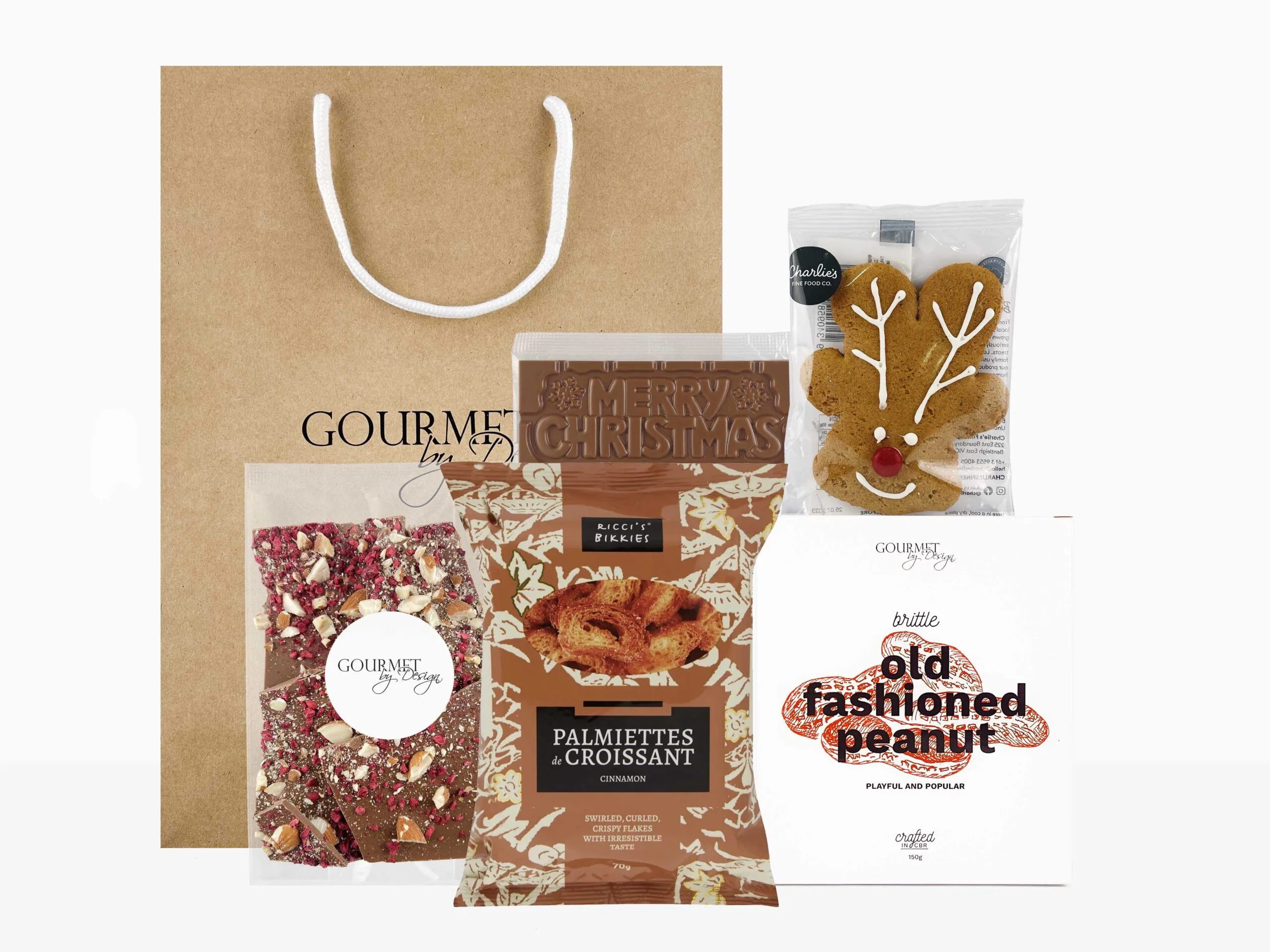 Spread holiday joy with the Festive Cheer Gift Bag, filled with a delightful assortment of seasonal treats. Each item is carefully chosen to balance sweet, crunchy, and buttery flavors that celebrate the magic of the season. Perfect for sharing with loved ones, it brings warmth and happiness to any gathering. From cozy mornings to festive celebrations, every bite evokes smiles and festive memories. Beautifully presented and ready to gift, this bag offers a simple yet thoughtful way to make the holidays extra special. Treat yourself or surprise someone with this joyful seasonal indulgence.