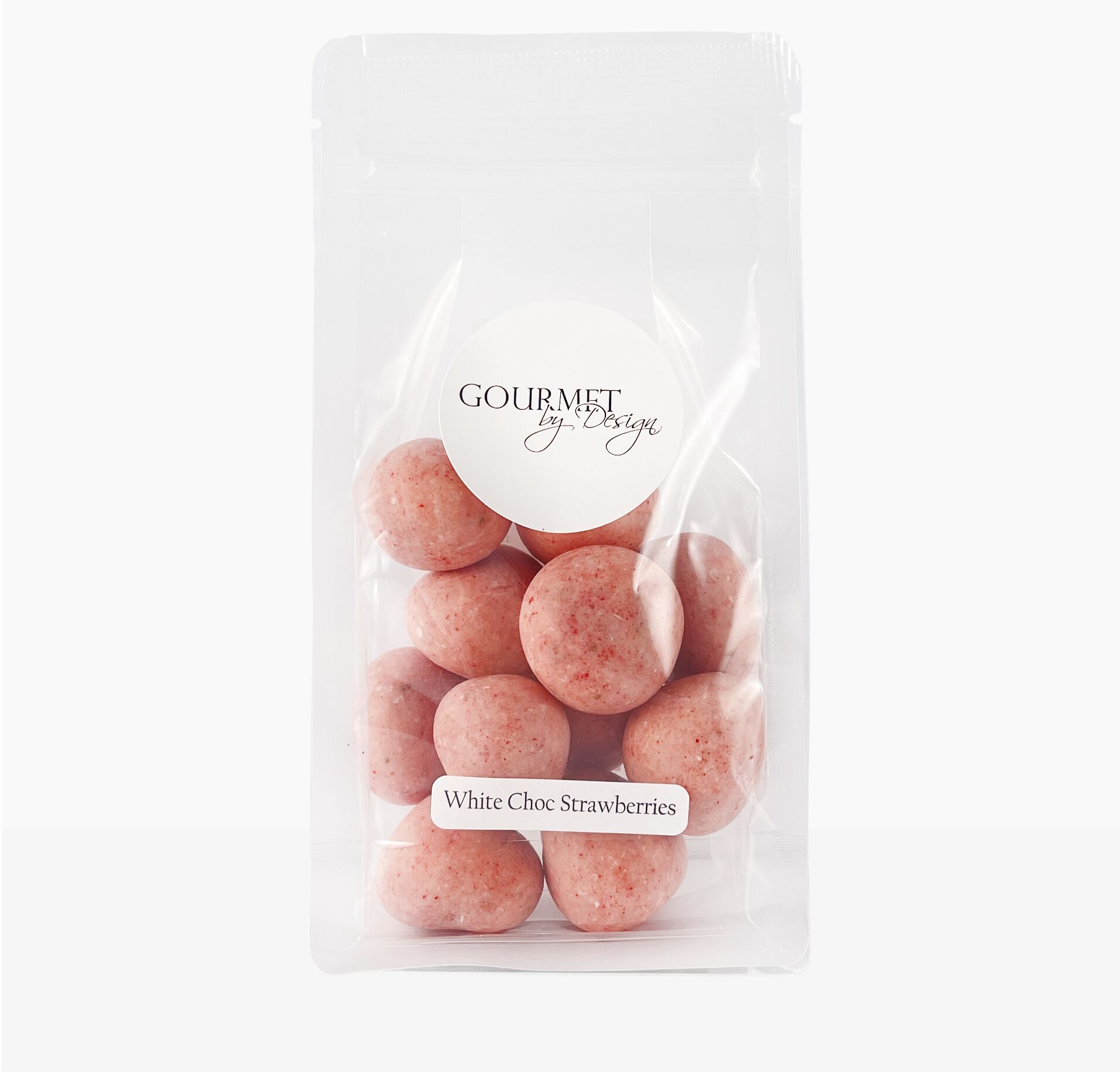 Freeze dried organic Australian strawberries coated in couverture white chocolate and dusted in organic strawberry dust. 150g