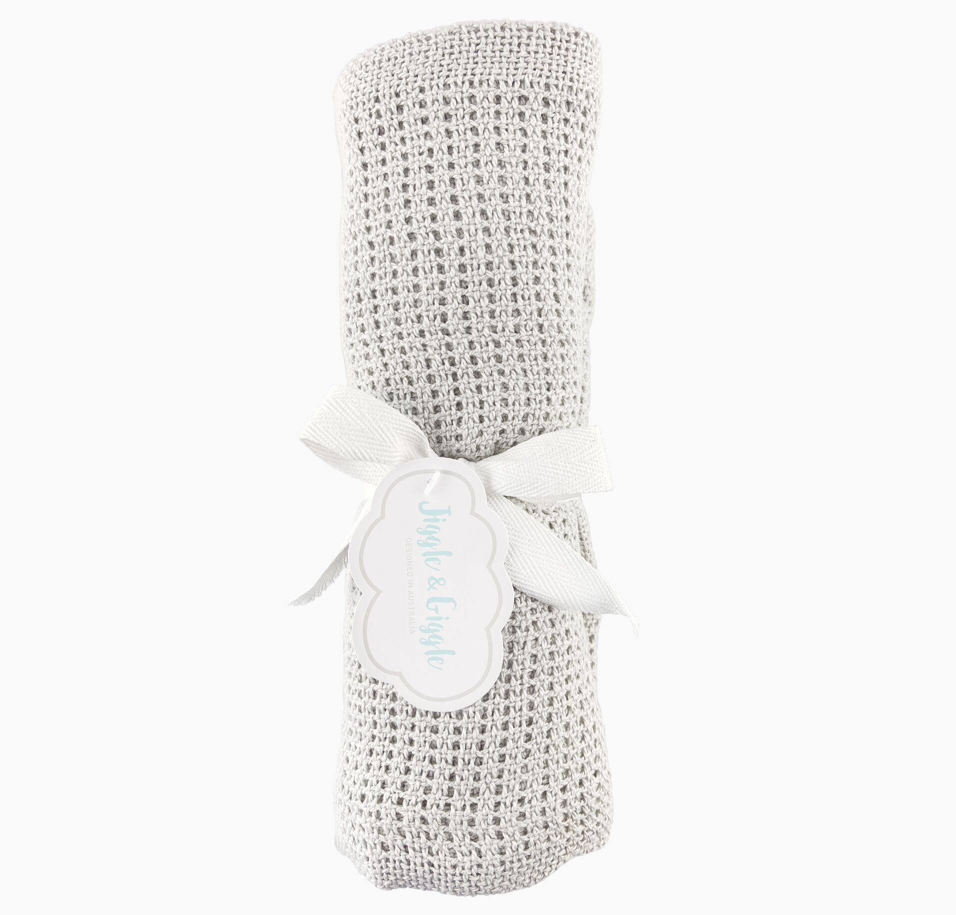 Grey Cotton Cellular Blanket. Lightweight and breathable, these gorgeous 100% cotton blankets are perfect to use in the cot or pram to keep baby feeling warm and cosy during their naps. Features tight weaves that won’t snag little fingers.