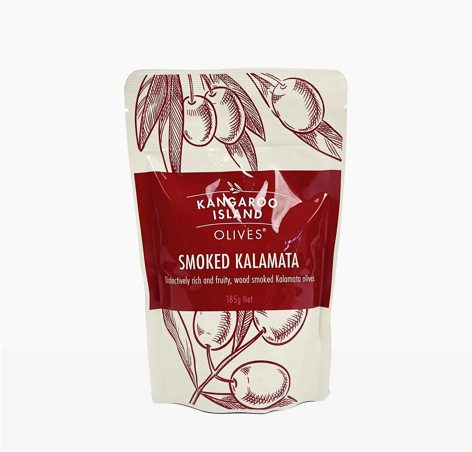 Kangaroo Island Smoked Kalamata Olives 185g. Distinctively rich and fruity, wood smoked Kalamata Olives.