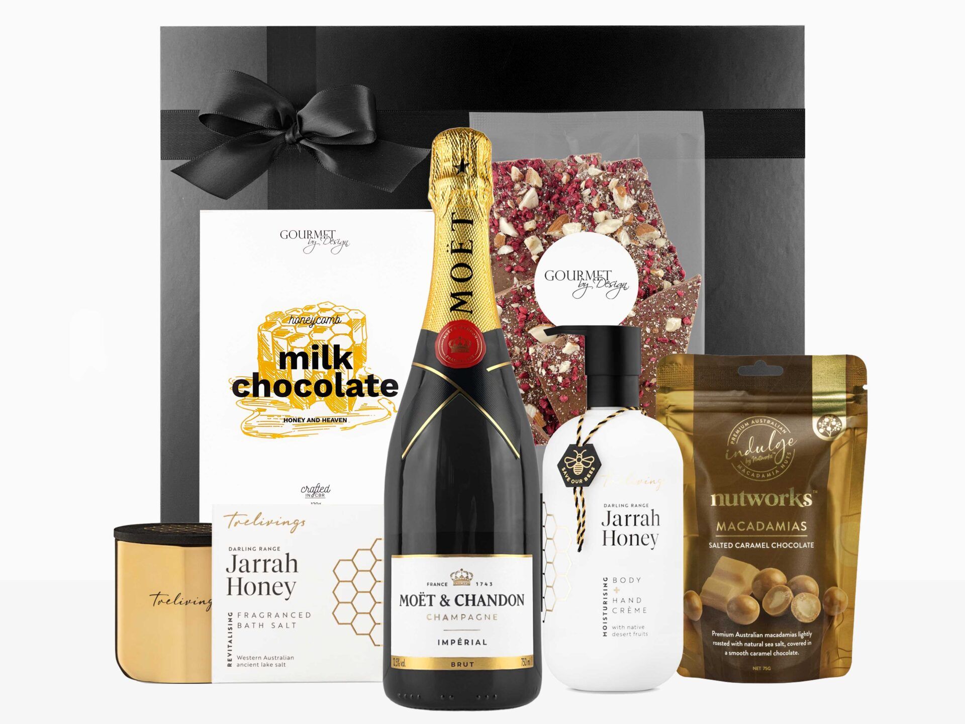 Moet Pamper Hamper is the ultimate pamper indulgence. Champagne from the iconic Moet & Chandon, self care products from Maine Beach and sweet Goodness from Gourmet by Design including brittle & rockyroad.
