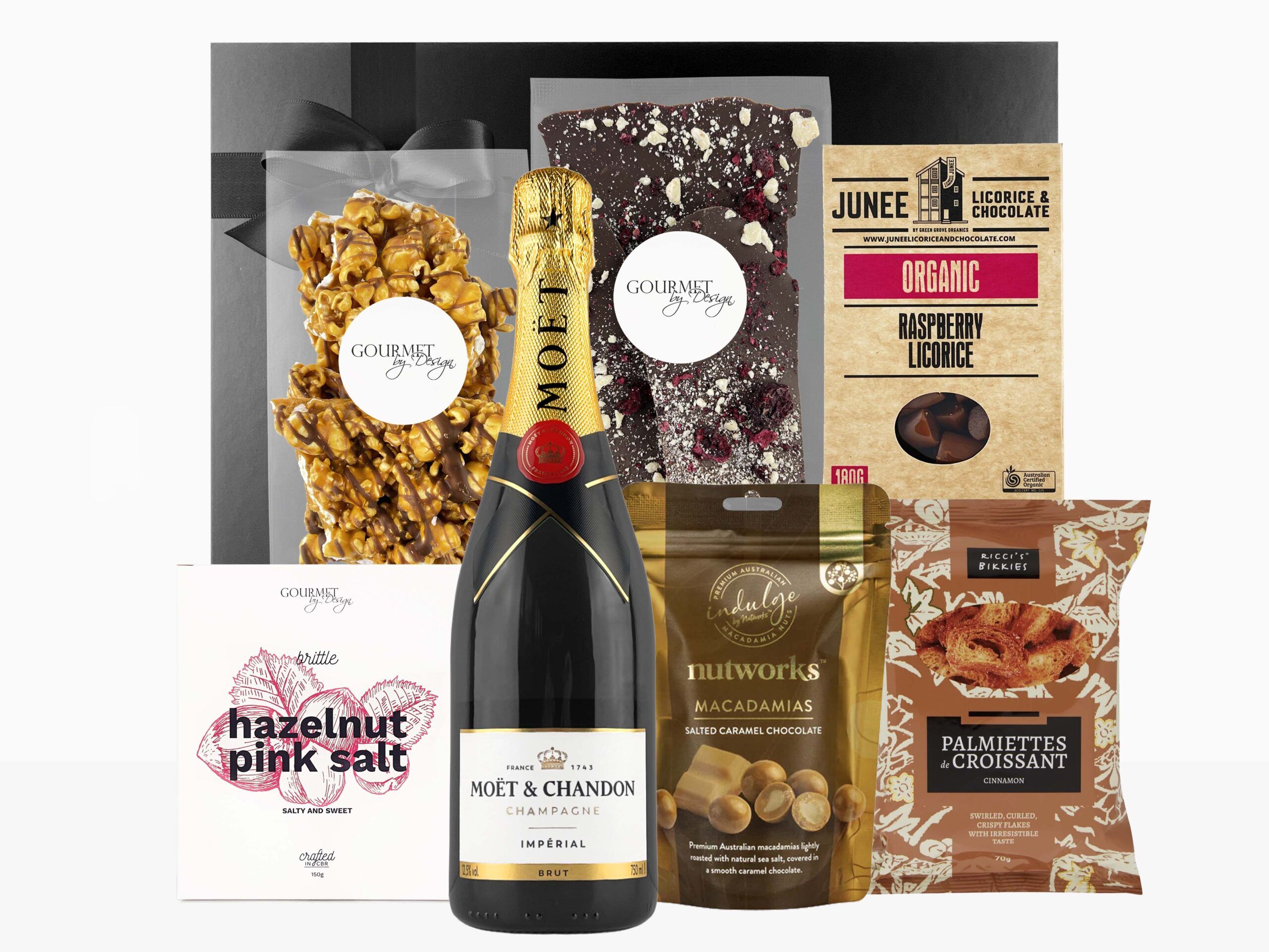 First, the hamper features Moët & Chandon Imperial Brut. Its crisp bubbles and bright flavours create an elegant start to any occasion. To accompany the champagne, we have included Ricci’s cinnamon croissants. These buttery, spiced pastries provide warmth and softness that contrast well with the sparkling wine. Additionally, salted hazelnut brittle adds a satisfying crunch. Its rich caramel notes complement the crispness of the champagne perfectly. Moreover, caramel popcorn offers a light, sweet crunch. It is fun to share and adds a playful touch to the selection. Chocolate lovers will appreciate the Black Forest dark chocolate bark. With deep cocoa and hints of cherry, it enhances the champagne’s dryness beautifully. Furthermore, Nutworks salted caramel chocolate macadamias combine creamy nuts with smooth chocolate. This pairing creates a rich, indulgent bite every time.For a fruity twist, Junee raspberry licorice delivers a soft chew and vibrant flavour. It balances the richness and adds variety to the hamper. Together, these treats create a diverse tasting experience full of contrast and harmony.