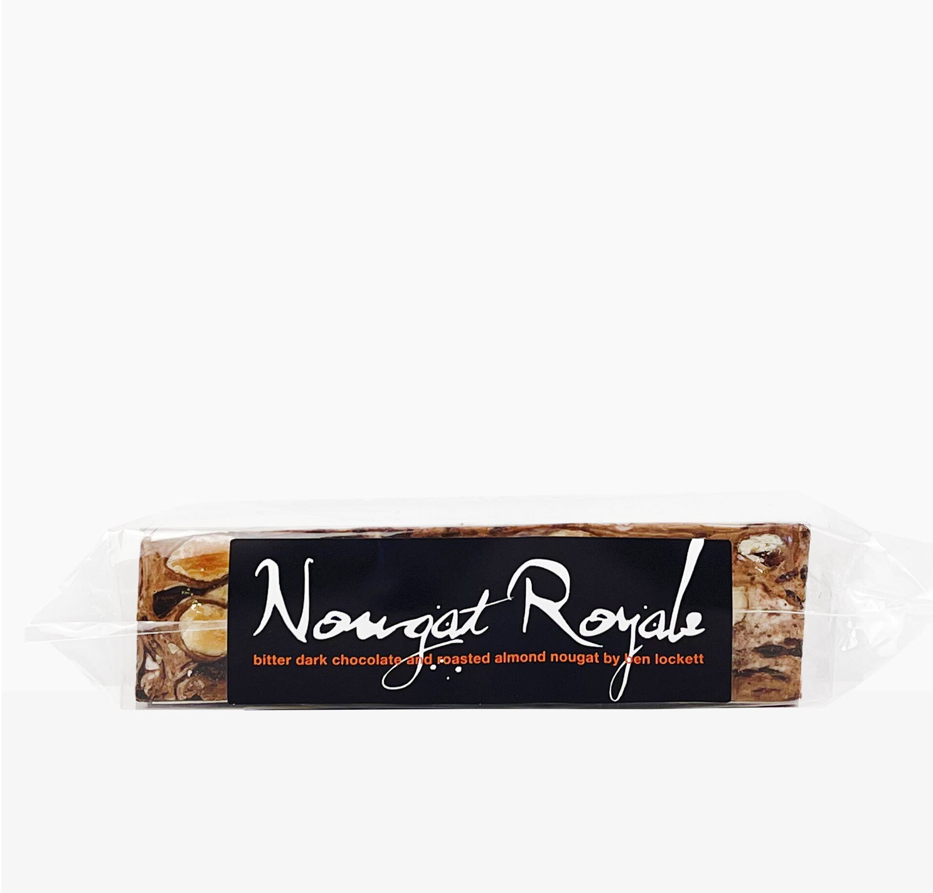 Nougat Royale Dark Chocolate Almond Nougat. Short and sweet, blending 70% Belgium dark chocolate with slow oven roasted Australian almonds, a classic combination. 125g