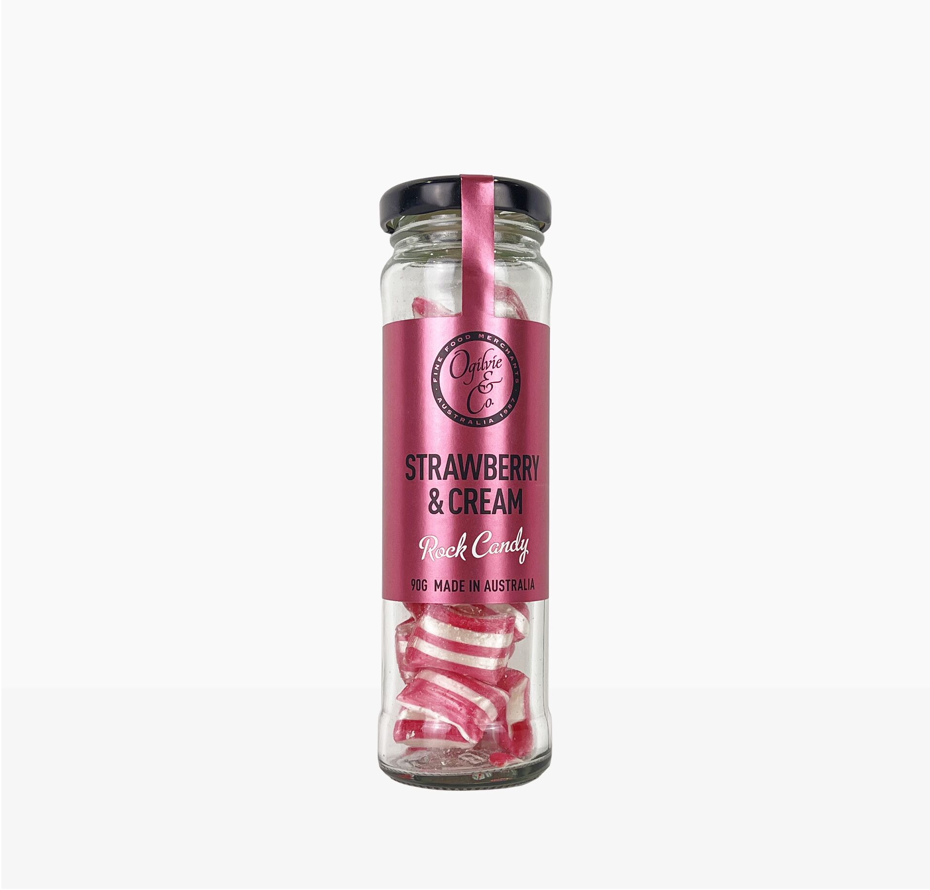 Ogilvie & Co Strawberry & Cream Rock Candy – luscious flavours of Strawberries and cream. 95g