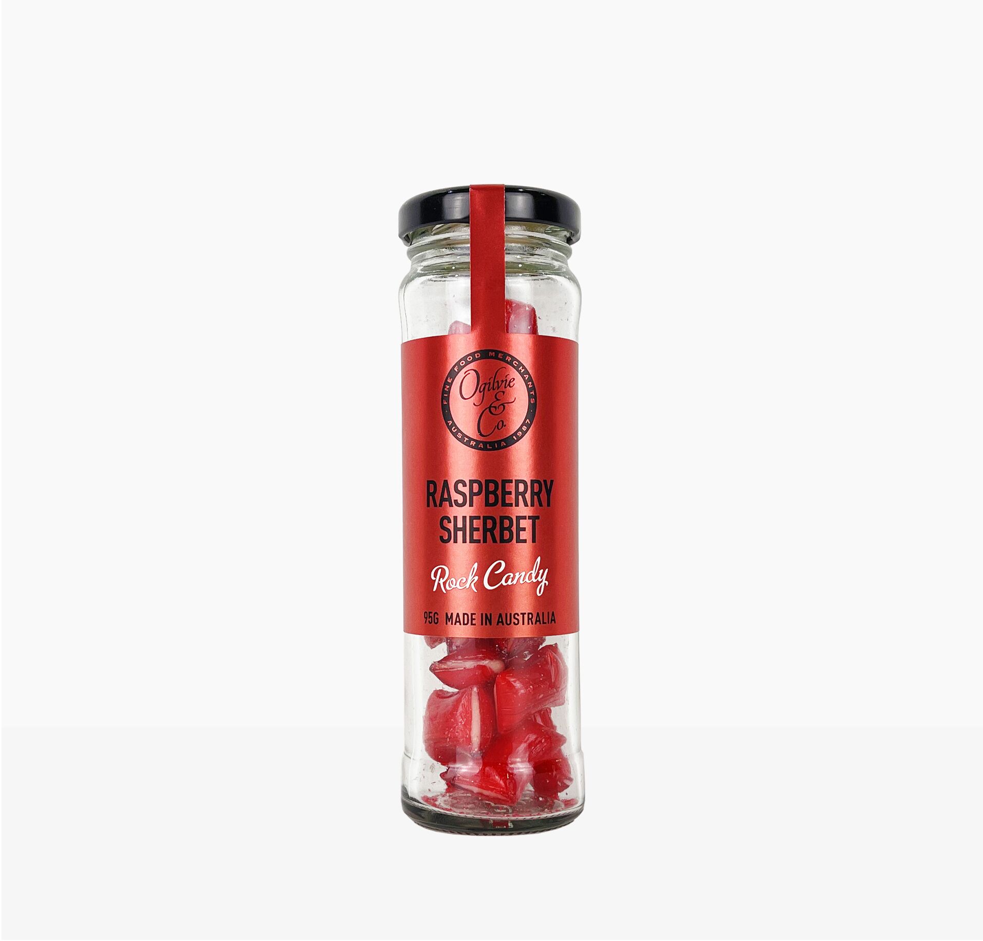 Ogilvie & Co Raspberry Sherbet Rock -raspberry flavour with a sherbet surprise in the centre! 95g