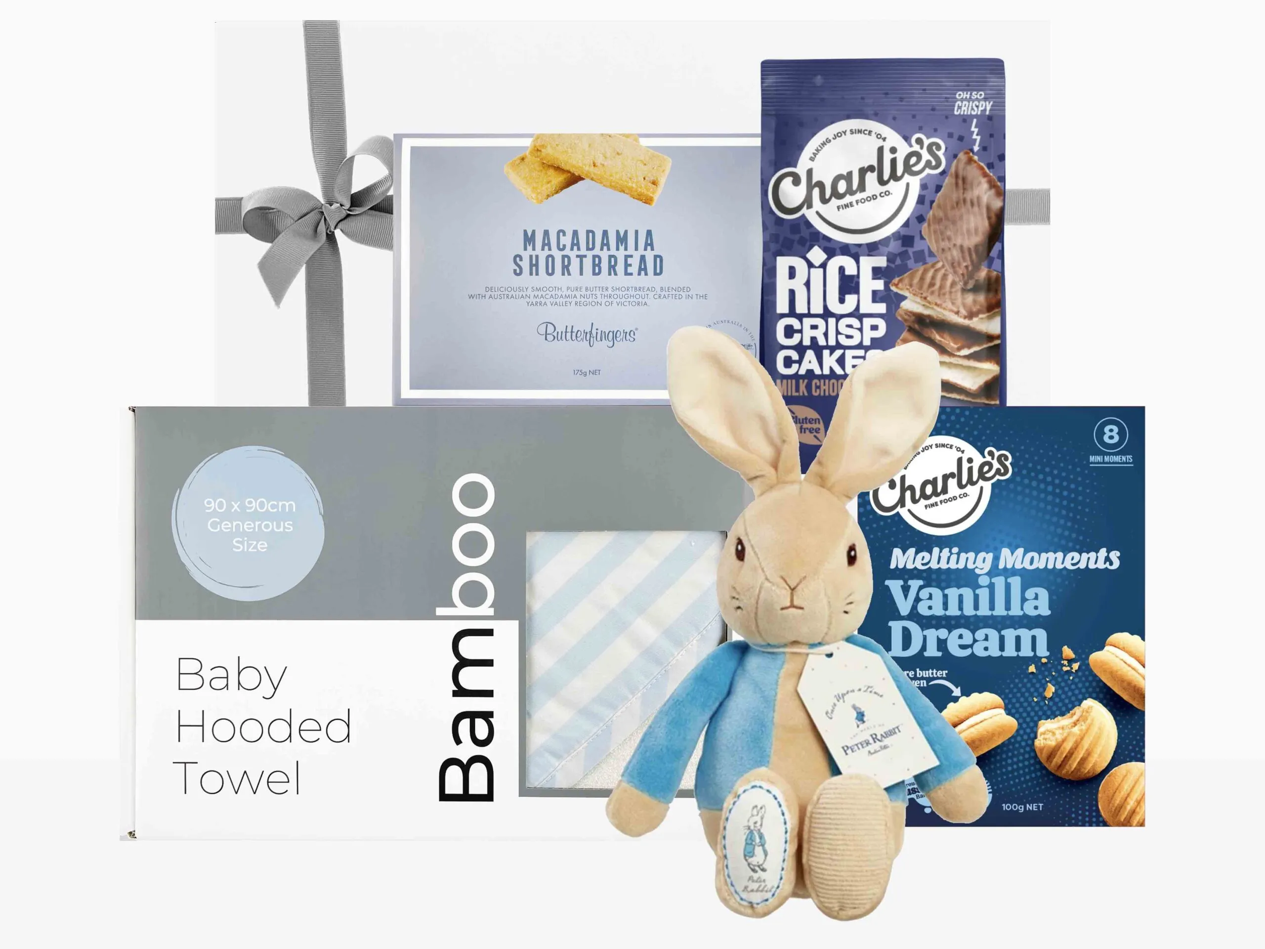 Welcome a little one with the charm and sweetness of the Peter Rabbit Baby Hamper. This delightful gift set includes a soft and cuddly Peter Rabbit plush teddy, a gentle light blue bamboo hooded towel perfect for bath time, and a selection of indulgent treats for the parents to enjoy—Butterfingers macadamia shortbread, Charlie’s milk chocolate rice crisp cakes, and vanilla dream melting moments. Thoughtfully curated for both baby and parents, this hamper brings warmth, comfort, and a touch of nostalgia to celebrate a beautiful new beginning.