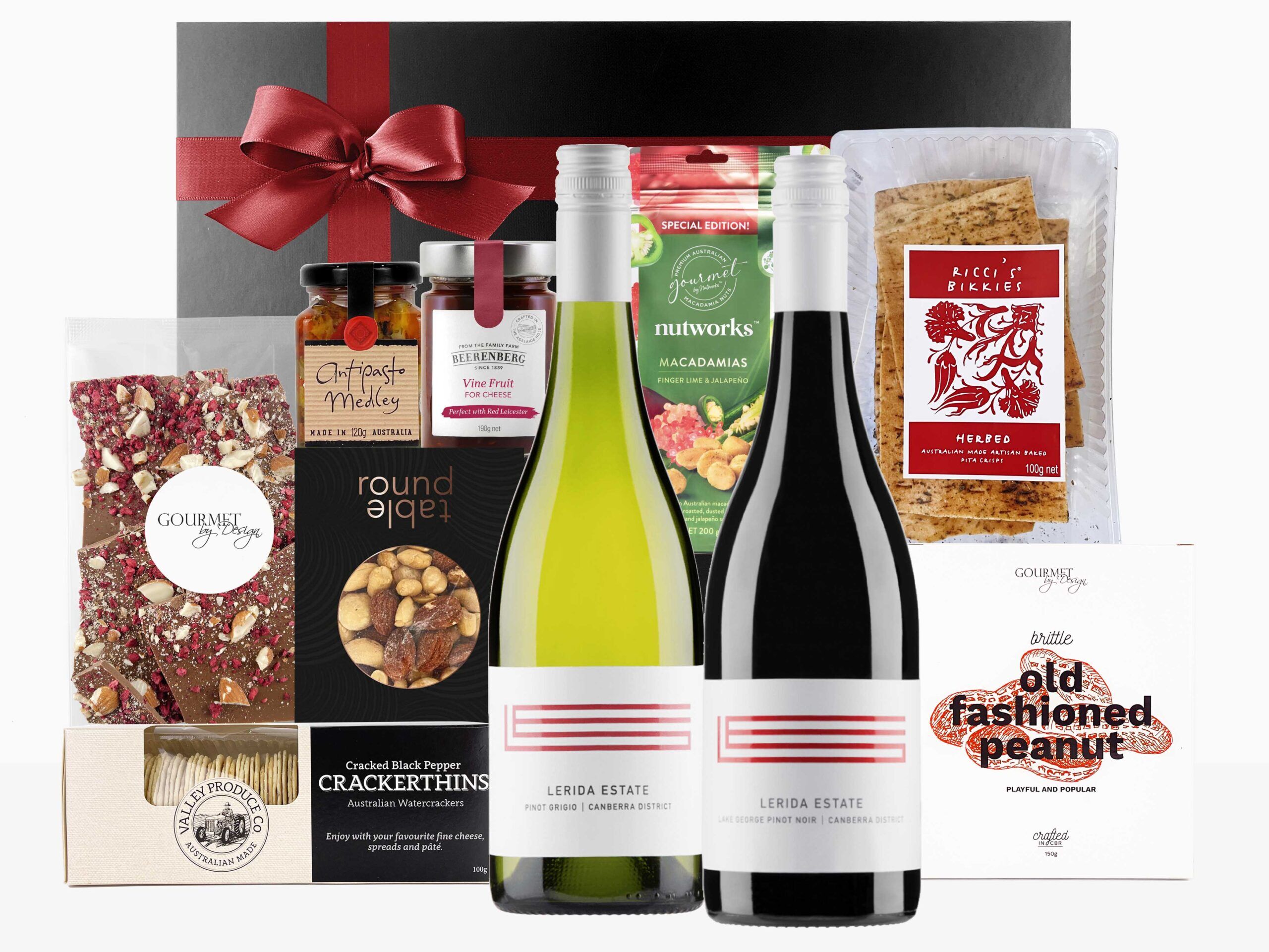 The Pinot Duo Christmas Hamper showcases two elegant wines from Lerida Estate, paired with gourmet foods for festive celebrations. The crisp, citrus-driven Pinot Grigio offers refreshing balance, while the silky Pinot Noir delivers red berry flavours and gentle spice. Moreover, savoury crackers, artisan spreads, and indulgent chocolates have been chosen to enhance each wine’s character. This thoughtful mix provides variety, ensuring something for every palate. Because it is beautifully presented, the hamper works as both a refined gift and a centrepiece for gatherings. With its balance of taste and style, it creates lasting memories throughout the season.