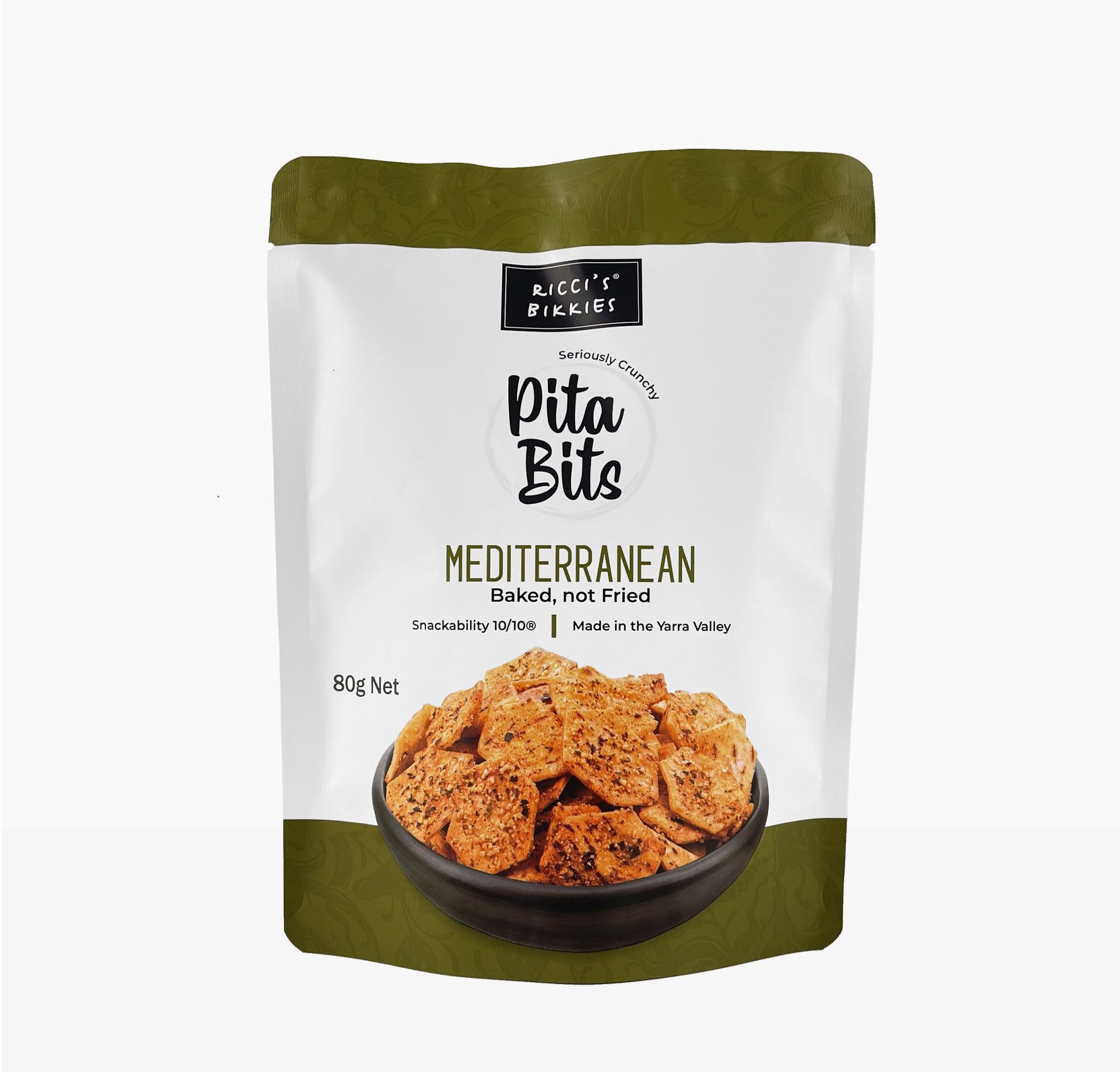 Ricci’s Bikkies Mediterranean Pita Bites are free from additives, all natural, crispy, seasoned pita snacks, perfect for dipping or standalone munching.