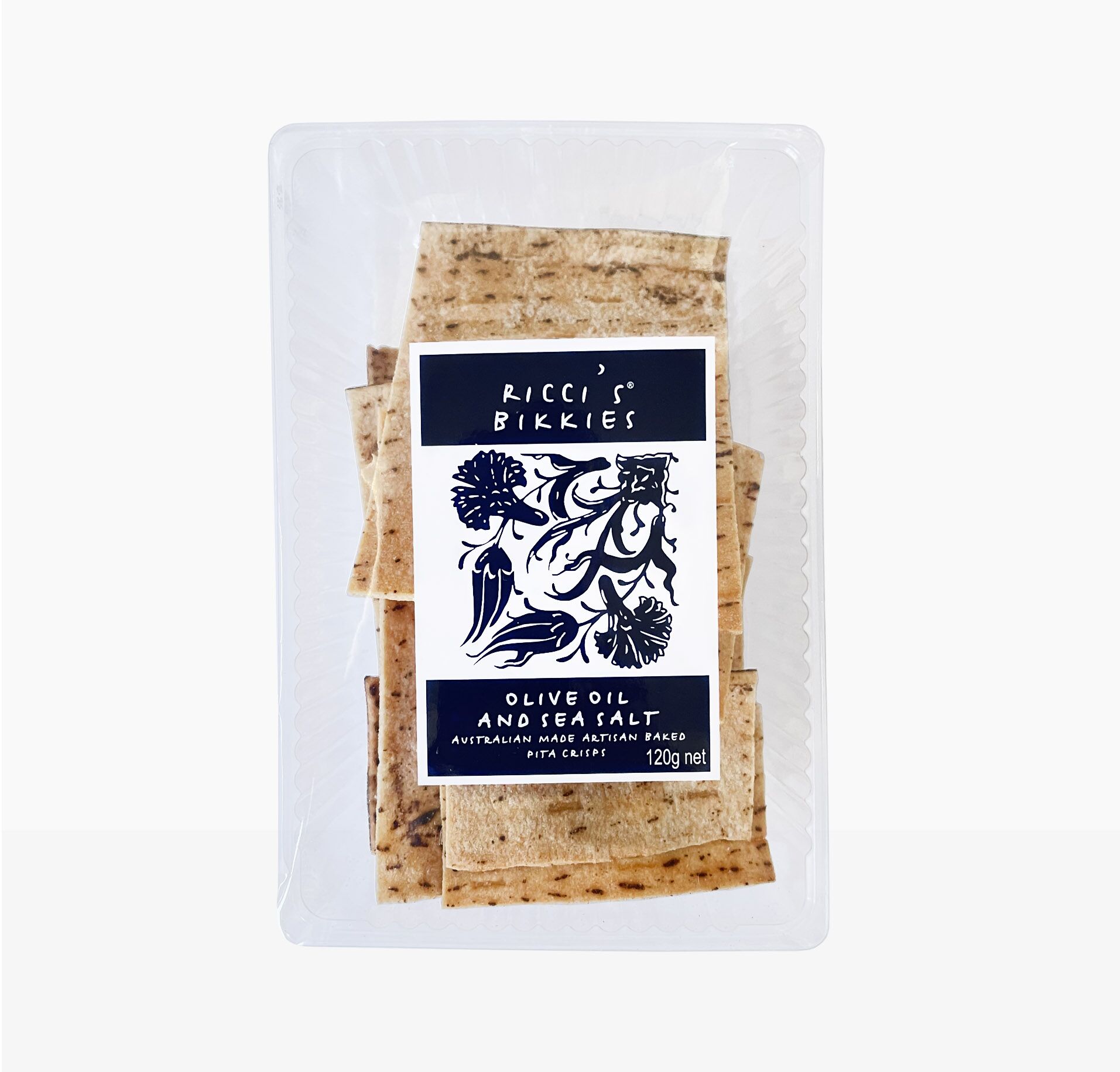 Ricci’s Bikkies Olive Oil & Sea Salt Pita. Australian made artisan baked pita crisps. 120g