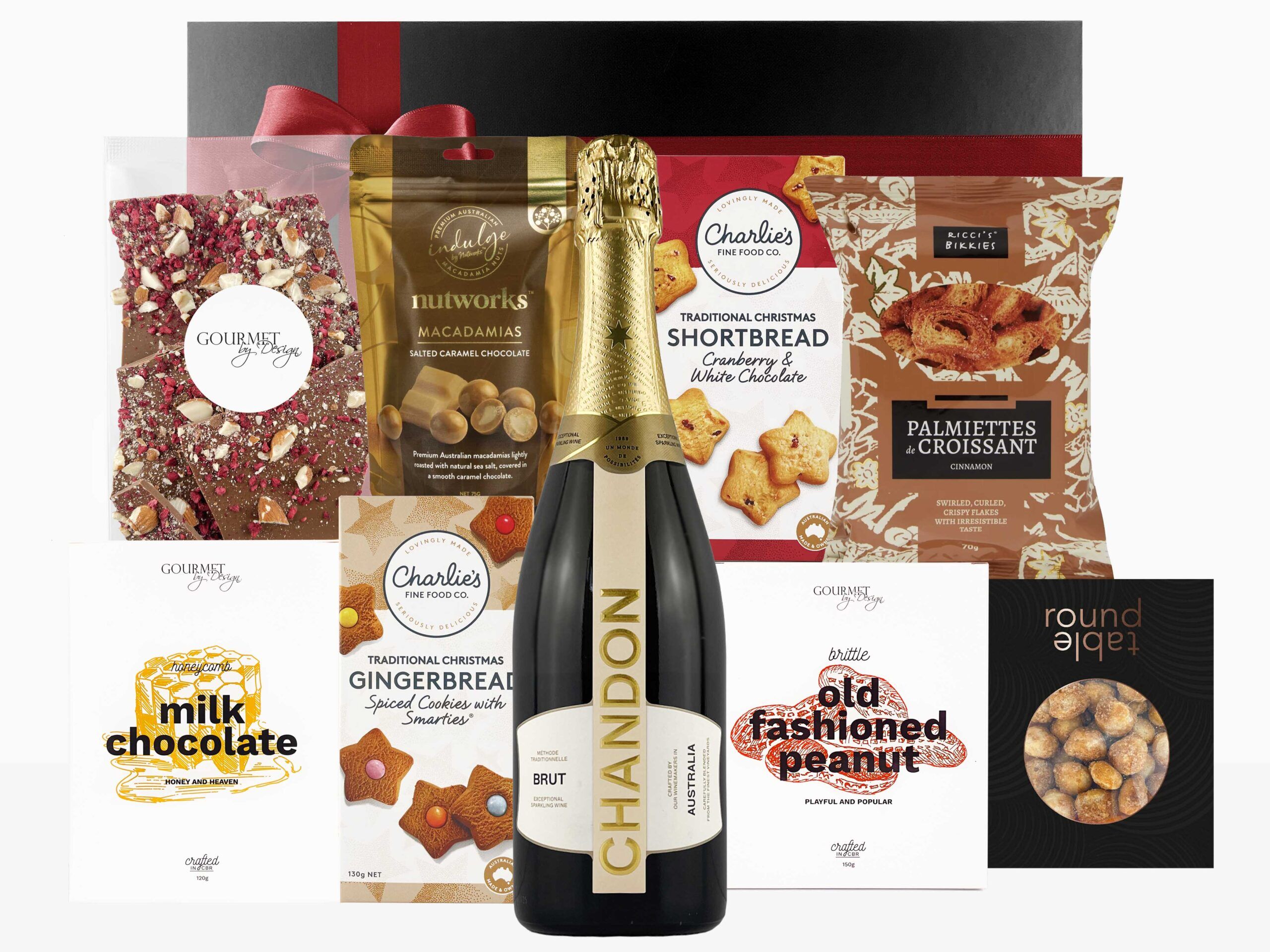 The Sparkling Christmas Hamper features Chandon Brut alongside gourmet foods chosen to complement its crisp, lively character. With citrus notes, stone fruit hints, and a refreshing finish, the sparkling wine sets the stage for festive celebrations. Moreover, artisan crackers, honey macadamias, and indulgent chocolate provide balance and variety. This thoughtful mix ensures there is something for everyone to enjoy. Because it arrives beautifully presented, the hamper works equally well as a refined gift or as part of holiday entertaining. Blending elegance, flavour, and festive spirit, it creates memorable moments that last well beyond the season.
