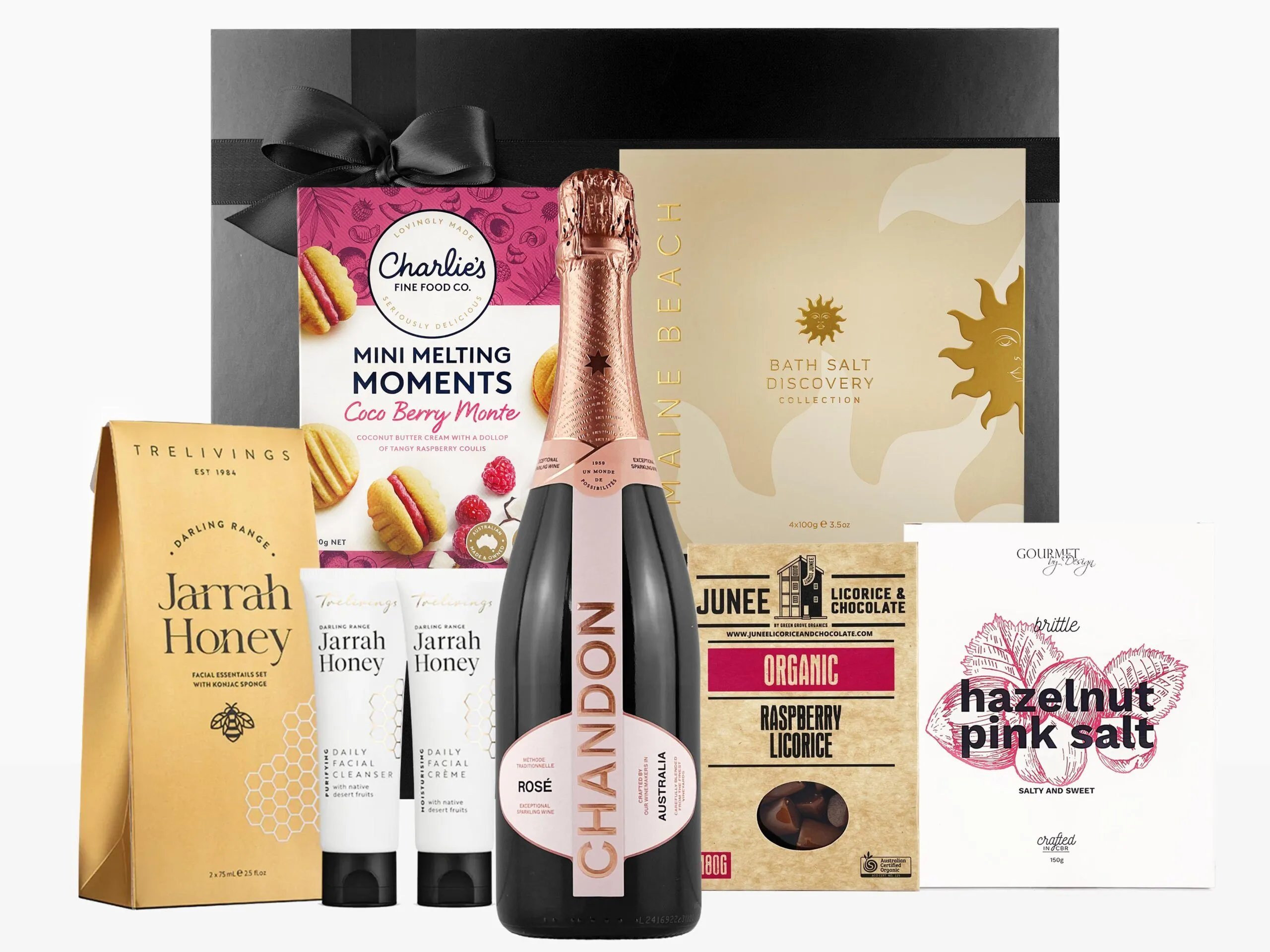 Spoil that special someone with a bottle of Sparkling Rose from Chandon, a premium Bath Salt Collection from Trelivings & Maine Beach & a fine selection of delicious Australian made sweets.