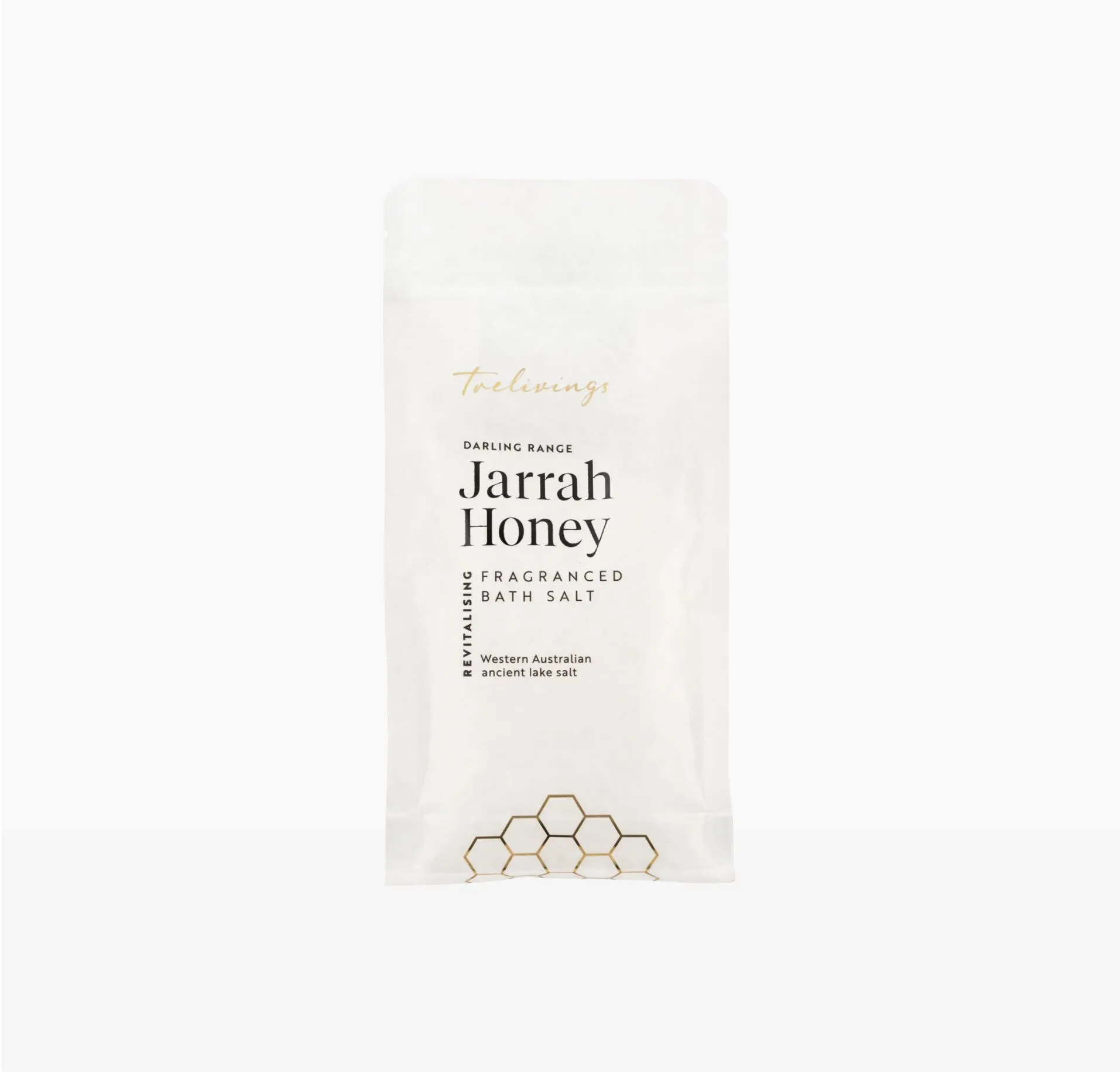 Trelivings Jarrah Honey Bath Salts Pouch. Pour a warm bath and add a handful (50g) of bath salt. Relax and be invigorated by the salt crystals, harvested from the 5 million year old Lake Deborah in Western Australia and infused with the extraordinary Jarrah Honey. 300g