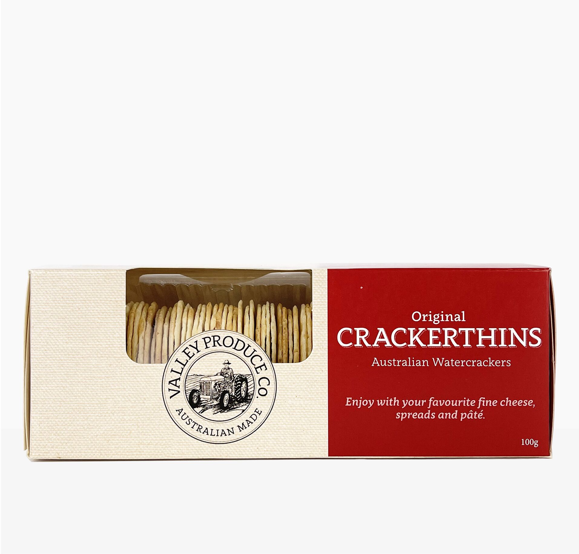 VPC Original Crackerthins . A premium water cracker. Fantastic with your favourite fine cheese and VPC Fruit pyramids! 100g