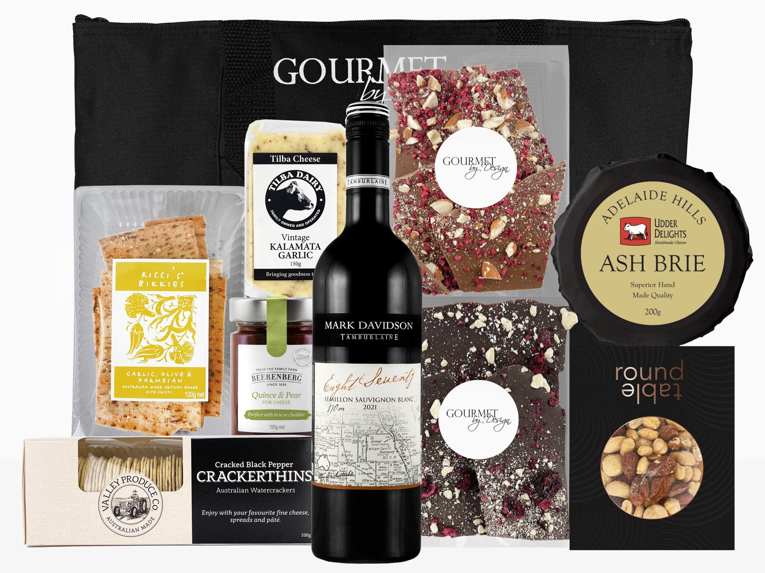 White Wine Cheese & Chocolate Tote Hamper includes a bottle of organically grown Chardonnay accompanied by sweet & savoury nibbles.