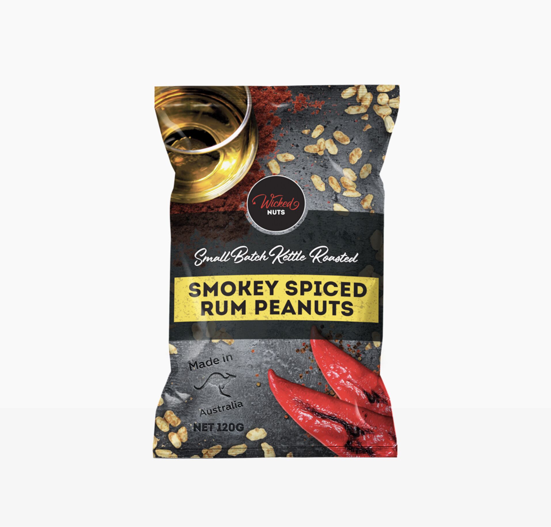 Wicked Nuts Smokey Spiced Rum Peanuts. A little smokey and a little chilli bite. Kettle roasted in small batches with the unmissable flavour of Spiced Rum makes for a highly addictive taste experience.